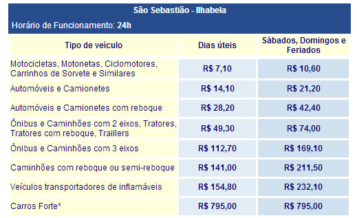 A travessia de balsa Ilhabela - São Sebastião funciona 24h por dia: das 6h as 00h a cada 30 minutos e das 0h as 6h a cada uma hora. A travessia demora de 15 a 20 minutos e o preço varia dependendo do dia (tabela ao lado). Você ainda pode pegar uma balsa com hora marcada, evitando filas e tempo. A compra desse serviço é realizada pela internet e o pagamento é feito por cartão de crédito.